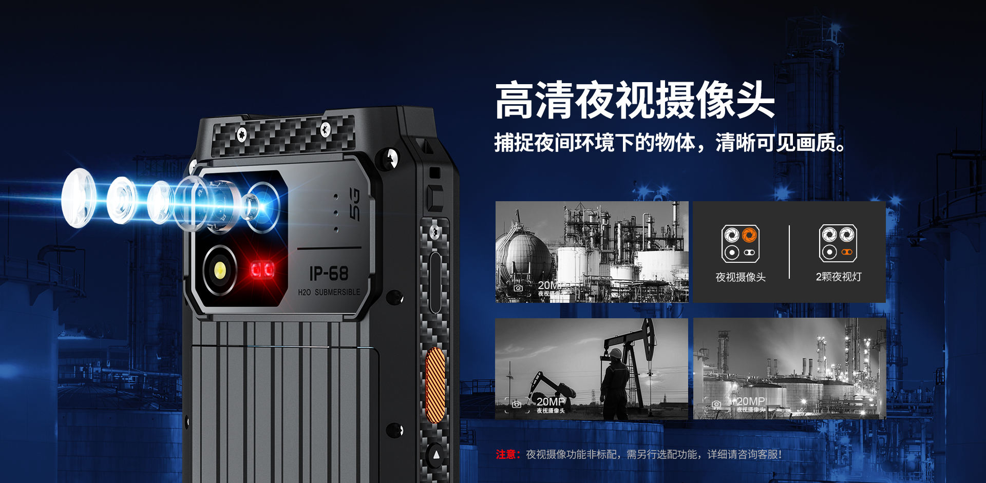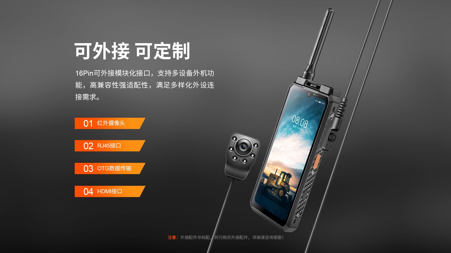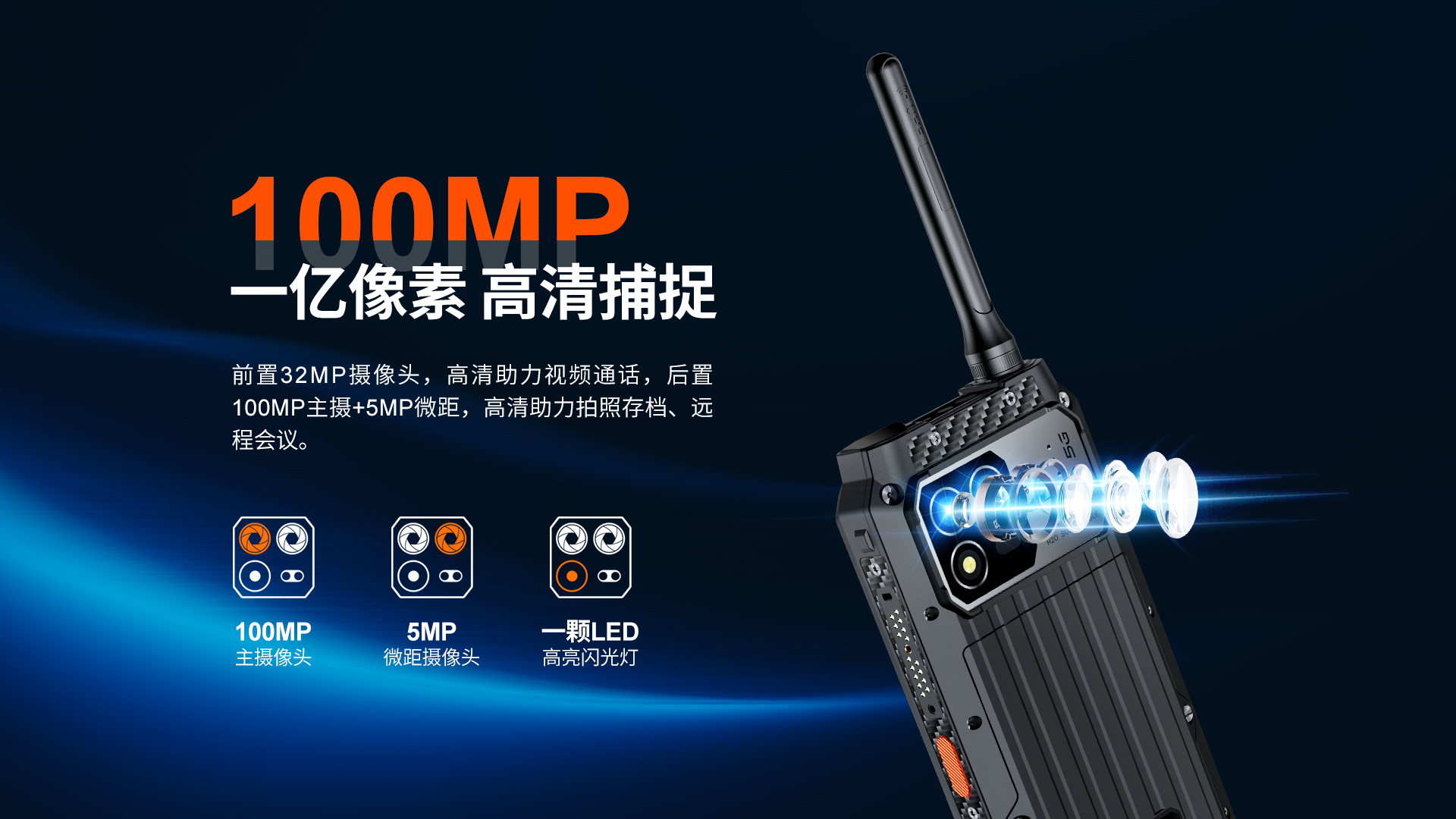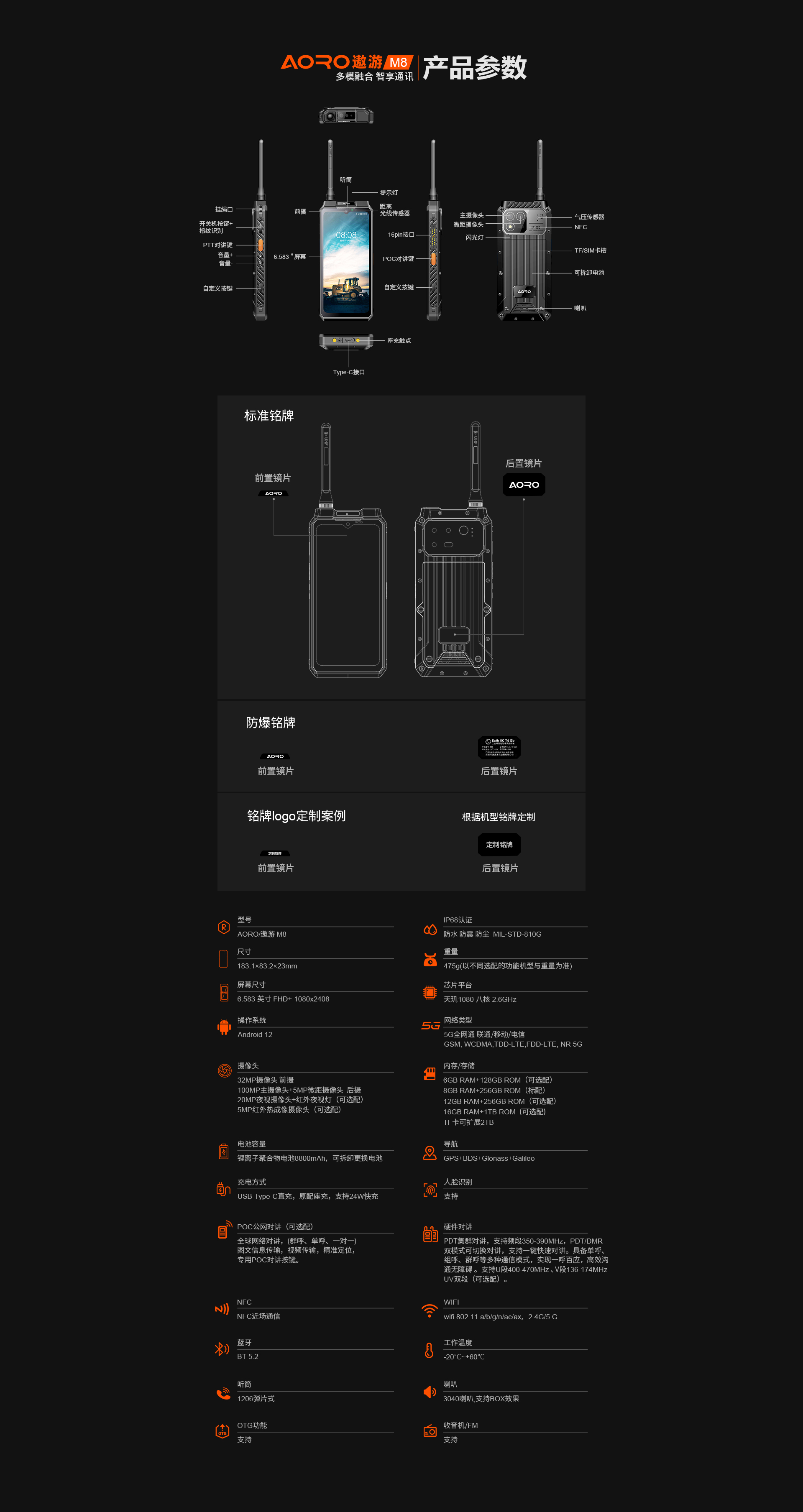 5G对讲+DMR/PDT集群对讲+PoC工业智能手机 | PTT+POC双对讲按键 | 5G全网通|广电5G|电信5G|移动5G|联通5G | 双卡双待 | Android 12系统 | 屏幕英寸 6.583 FHD 1080*2408 | 天玑1080 2.6GHz 八核 | 机身内存 16GB RAM+1TB ROM | 扩展内存支持(2TB) | 聚合物锂离子电池8800mAh(可拆换电池)超长待机 | 前置32MP 后置100MP+500W微距+夜视/热成像(二选一) | IP68/IP69K 防水|防震|防尘认证 1.5米水下浸泡40分钟测试 | NFC | OTG功能 | 前侧面纹识别 | 座充 | 红外热成像/红外夜视(可选配)